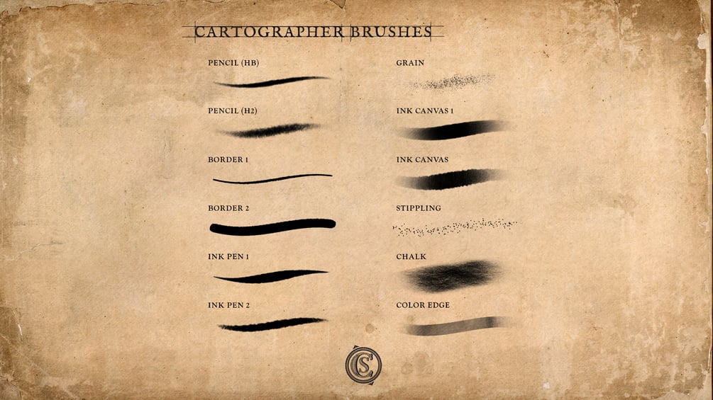 - 12 Cartographer Brushes (pencils, pens, paint, chalk, stippling)